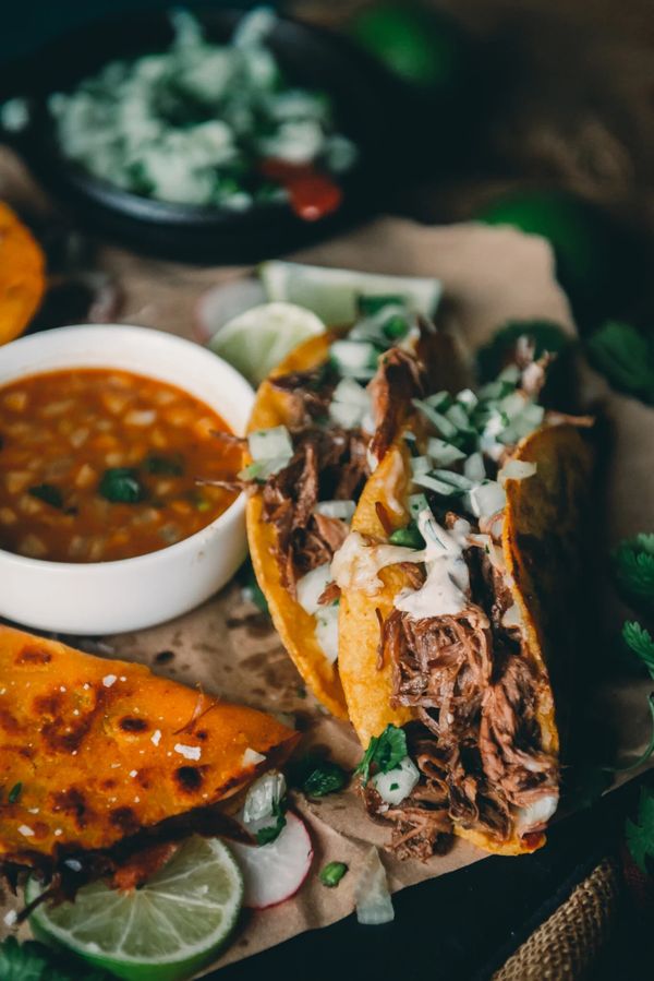 Quesataco, a quesadilla with birria meat, accompanied by cilantro and onion (according to your preference), with lime and a delicious salsa that will make the flavor even more delicious. Dipping sauce is included with every two tacos purchased.